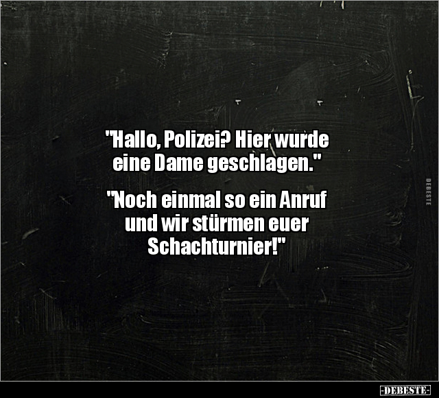 "Hallo, Polizei? Hier wurde eine Dame geschlagen." "Noch einmal so ein Anruf und wir stürmen euer Schachturnier!"
