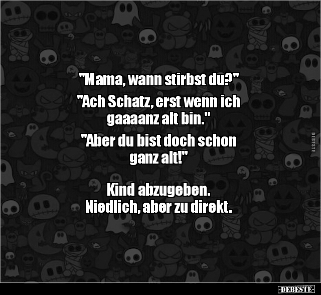 "Mama, wann stirbst du?" "Ach Schatz, erst wenn ich gaaaanz alt bin." "Aber du bist doch schon ganz alt!" Kind abzugeben. Niedlich, aber zu direkt.