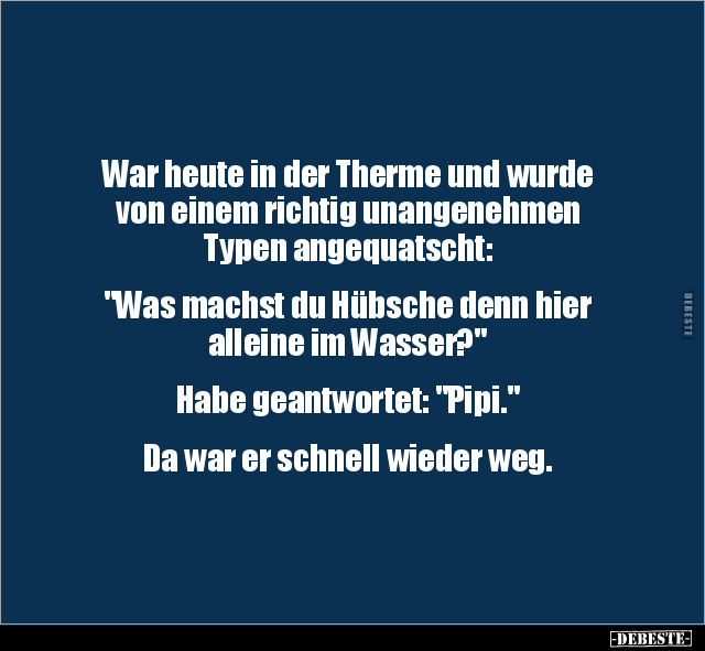 War heute in der Therme und wurde von einem richtig unangenehmen Typen angequatscht: "Was machst du Hübsche denn hier alleine im Wasser?" Habe geantwortet: "Pipi." Da war er schnell wieder weg.