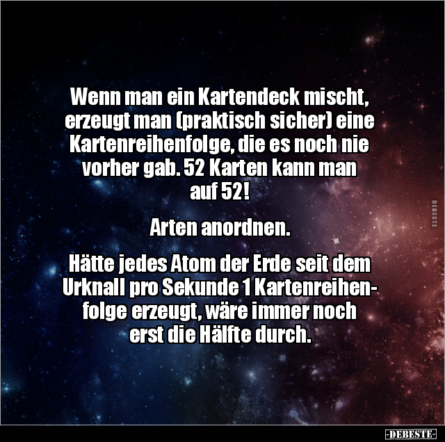 Wenn man ein Kartendeck mischt, erzeugt man (praktisch sicher) eine Kartenreihenfolge, die es noch nie vorher gab. 52 Karten kann man auf 52! Arten anordnen. Hätte jedes Atom der Erde seit dem Urknall pro Sekunde 1 Kartenreihen- folge erzeugt, wäre immer noch erst die Hälfte durch.