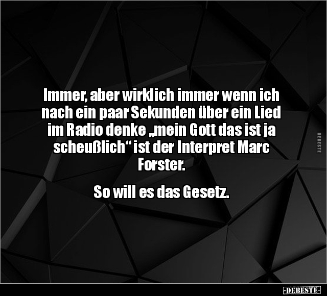 Immer, aber wirklich immer wenn ich nach ein paar Sekunden über ein Lied im Radio denke „mein Gott das ist ja scheußlich“ ist der Interpret Marc Forster. So will es das Gesetz.