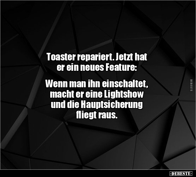 Toaster repariert. Jetzt hat er ein neues Feature: Wenn man ihn einschaltet, macht er eine Lightshow und die Hauptsicherung fliegt raus.