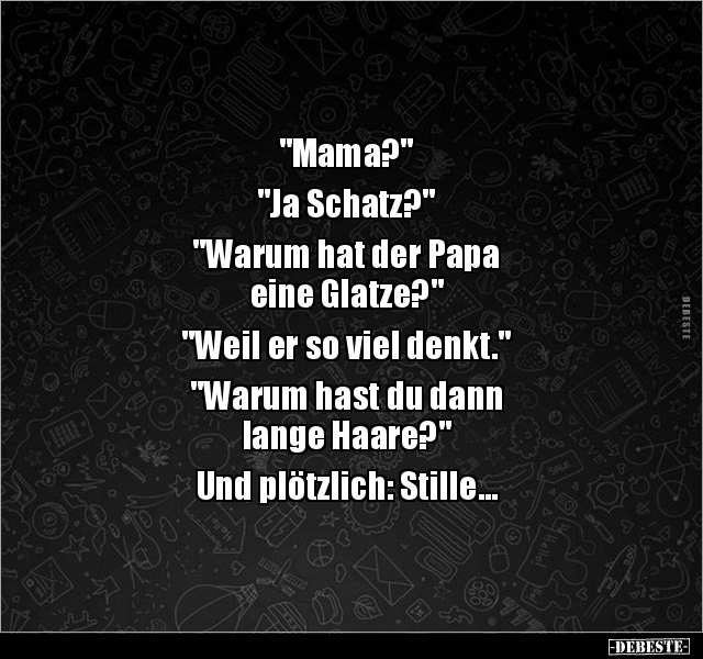 "Mama?" "Ja Schatz?" "Warum hat der Papa eine Glatze?" "Weil er so viel denkt." "Warum hast du dann lange Haare?" Und plötzlich: Stille...