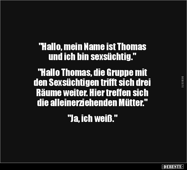 "Hallo, mein Name ist Thomas und ich bin sexsüchtig." "Hallo Thomas, die Gruppe mit den Sexsüchtigen trifft sich drei Räume weiter. Hier treffen sich die alleinerziehenden Mütter." "Ja, ich weiß."