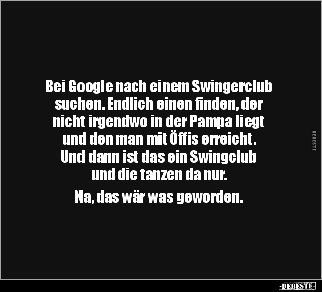 Bei Google nach einem Swingerclub suchen. Endlich einen finden, der nicht irgendwo in der Pampa liegt und den man mit Öffis erreicht. Und dann ist das ein Swingclub und die tanzen da nur. Na, das wär was geworden.