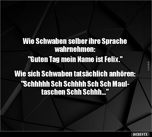 Wie Schwaben selber ihre Sprache wahrnehmen: "Guten Tag mein Name ist Felix." Wie sich Schwaben tatsächlich anhören: "Schhhhh Sch Schhhh Sch Sch Maul- taschen Schh Schhh..."