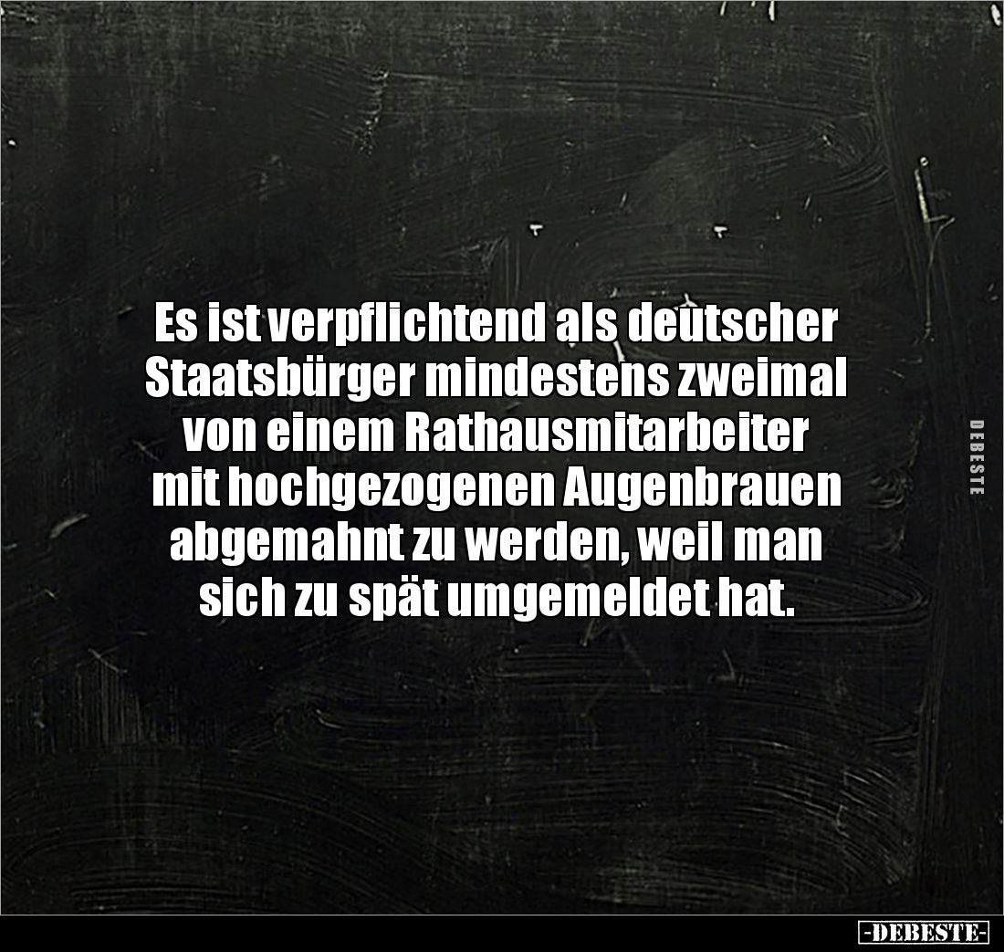 Es ist verpflichtend als deutscher Staatsbürger mindestens zweimal von einem Rathausmitarbeiter mit hochgezogenen Augenbrauen abgemahnt zu werden, weil man sich zu spät umgemeldet hat.