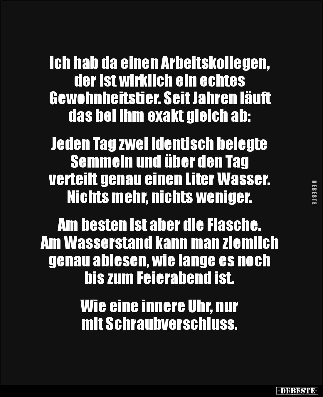 Ich hab da einen Arbeitskollegen, der ist wirklich ein echtes Gewohnheitstier. Seit Jahren läuft das bei ihm exakt gleich ab: Jeden Tag zwei identisch belegte Semmeln und über den Tag verteilt genau einen Liter Wasser. Nichts mehr, nichts weniger. Am besten ist aber die Flasche. Am Wasserstand kann man ziemlich genau ablesen, wie lange es noch bis zum Feierabend ist. Wie eine innere Uhr, nur mit Schraubverschluss.