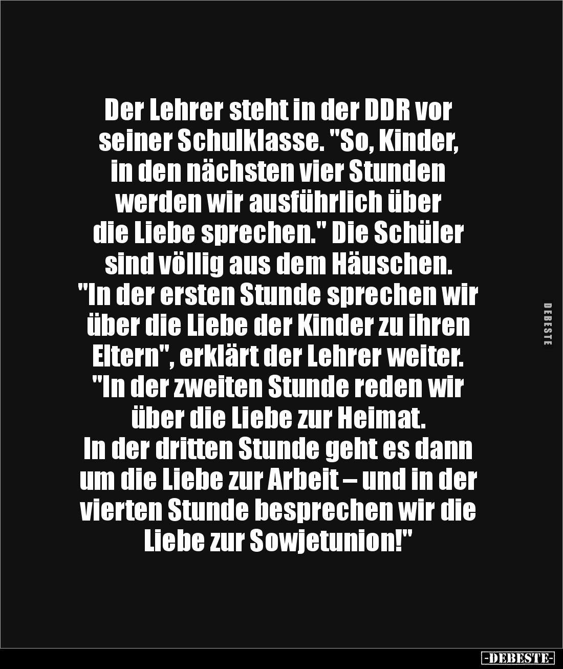 Der Lehrer steht in der DDR vor seiner Schulklasse. "So, Kinder, in den nächsten vier Stunden werden wir ausführlich über die Liebe sprechen." Die Schüler sind völlig aus dem Häuschen. "In der ersten Stunde sprechen wir über die Liebe der Kinder zu ihren Eltern", erklärt der Lehrer weiter. "In der zweiten Stunde reden wir über die Liebe zur Heimat. In der dritten Stunde geht es dann um die Liebe zur Arbeit – und in der vierten Stunde besprechen wir die Liebe zur Sowjetunion!"