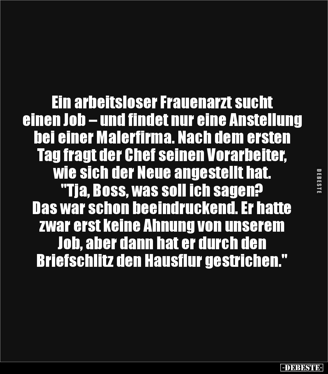 Ein arbeitsloser Frauenarzt sucht einen Job – und findet nur eine Anstellung bei einer Malerfirma. Nach dem ersten Tag fragt der Chef seinen Vorarbeiter, wie sich der Neue angestellt hat. "Tja, Boss, was soll ich sagen? Das war schon beeindruckend. Er hatte zwar erst keine Ahnung von unserem Job, aber dann hat er durch den Briefschlitz den Hausflur gestrichen."
