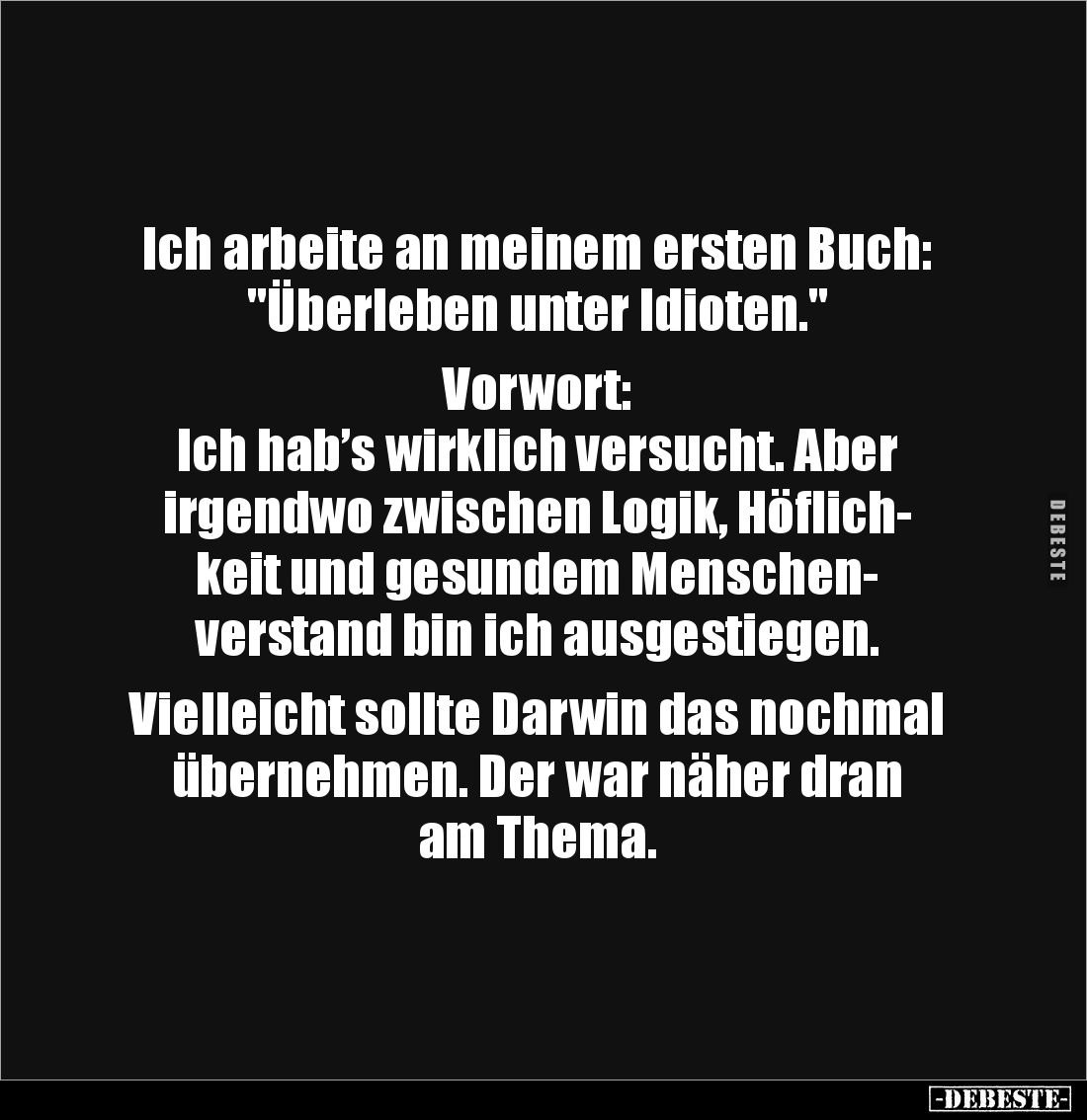 Ich arbeite an meinem ersten Buch: "Überleben unter Idioten." Vorwort: Ich hab’s wirklich versucht. Aber irgendwo zwischen Logik, Höflich- keit und gesundem Menschen- verstand bin ich ausgestiegen. Vielleicht sollte Darwin das nochmal übernehmen. Der war näher dran am Thema.