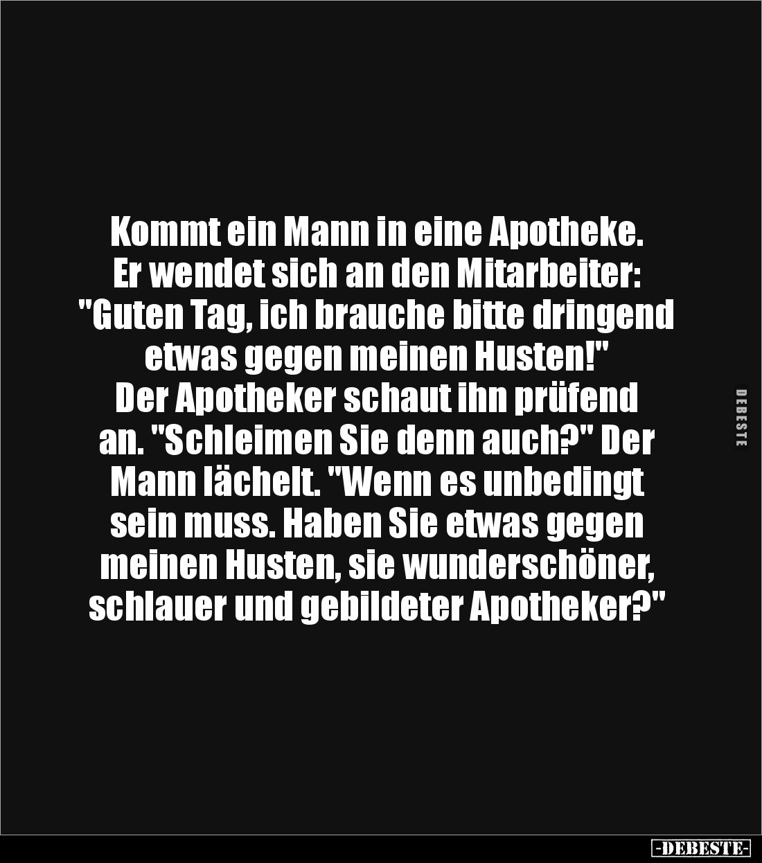 Kommt ein Mann in eine Apotheke. Er wendet sich an den Mitarbeiter: "Guten Tag, ich brauche bitte dringend etwas gegen meinen Husten!" Der Apotheker schaut ihn prüfend an. "Schleimen Sie denn auch?" Der Mann lächelt. "Wenn es unbedingt sein muss. Haben Sie etwas gegen meinen Husten, sie wunderschöner, schlauer und gebildeter Apotheker?"