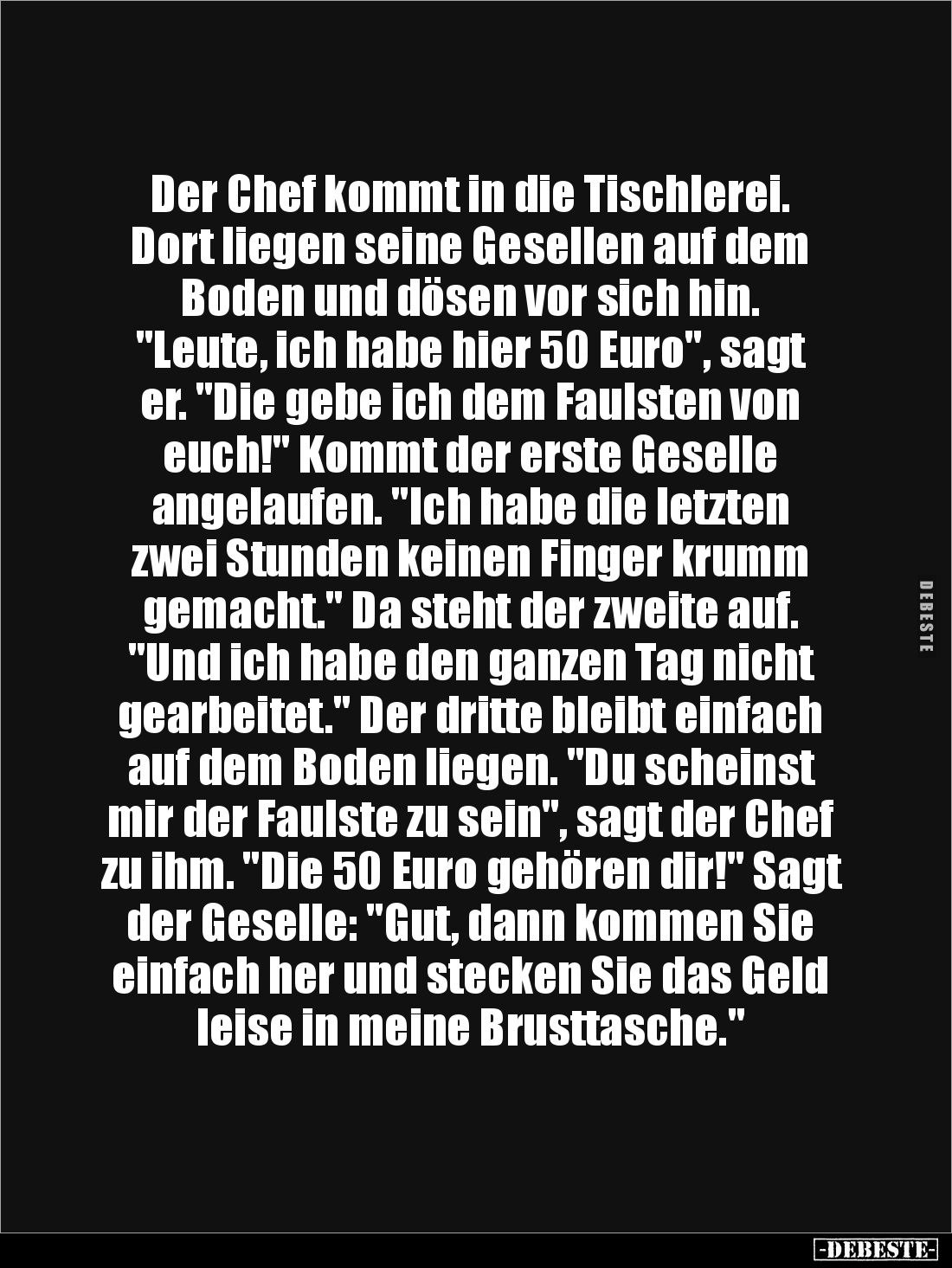 Der Chef kommt in die Tischlerei. Dort liegen seine Gesellen auf dem Boden und dösen vor sich hin. "Leute, ich habe hier 50 Euro", sagt er. "Die gebe ich dem Faulsten von euch!" Kommt der erste Geselle angelaufen. "Ich habe die letzten zwei Stunden keinen Finger krumm gemacht." Da steht der zweite auf. "Und ich habe den ganzen Tag nicht gearbeitet." Der dritte bleibt einfach auf dem Boden liegen. "Du scheinst mir der Faulste zu sein", sagt der Chef zu ihm. "Die 50 Euro gehören dir!" Sagt der Geselle: "Gut, dann kommen Sie einfach her und stecken Sie das Geld leise in meine Brusttasche."