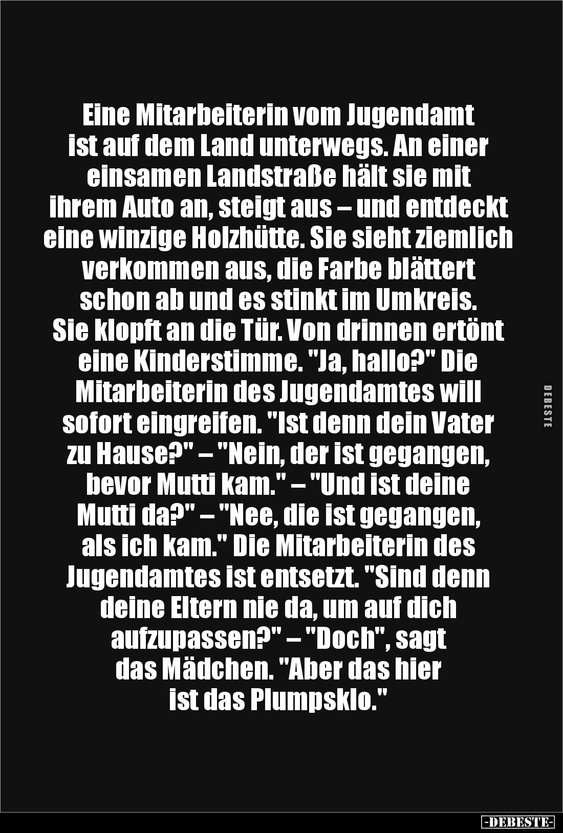 Eine Mitarbeiterin vom Jugendamt ist auf dem Land unterwegs. An einer einsamen Landstraße hält sie mit ihrem Auto an, steigt aus – und entdeckt eine winzige Holzhütte. Sie sieht ziemlich verkommen aus, die Farbe blättert schon ab und es stinkt im Umkreis. Sie klopft an die Tür. Von drinnen ertönt eine Kinderstimme. "Ja, hallo?" Die Mitarbeiterin des Jugendamtes will sofort eingreifen. "Ist denn dein Vater zu Hause?" – "Nein, der ist gegangen, bevor Mutti kam." – "Und ist deine Mutti da?" – "Nee, die ist gegangen, als ich kam." Die Mitarbeiterin des Jugendamtes ist entsetzt. "Sind denn deine Eltern nie da, um auf dich aufzupassen?" – "Doch", sagt das Mädchen. "Aber das hier ist das Plumpsklo."