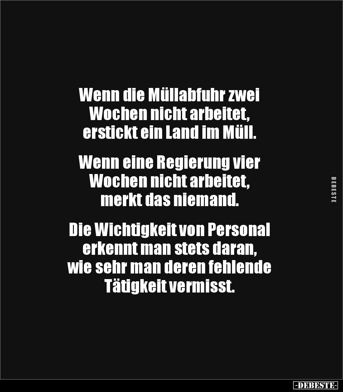Wenn die Müllabfuhr zwei Wochen nicht arbeitet, erstickt ein Land im Müll. Wenn eine Regierung vier Wochen nicht arbeitet, merkt das niemand. Die Wichtigkeit von Personal erkennt man stets daran, wie sehr man deren fehlende Tätigkeit vermisst.