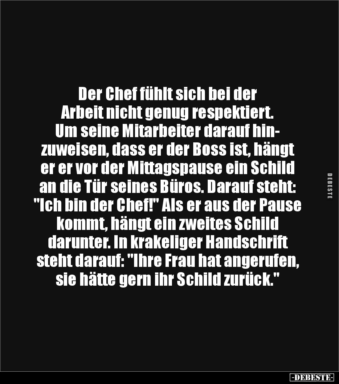 Der Chef fühlt sich bei der Arbeit nicht genug respektiert. Um seine Mitarbeiter darauf hin- zuweisen, dass er der Boss ist, hängt er er vor der Mittagspause ein Schild an die Tür seines Büros. Darauf steht: "Ich bin der Chef!" Als er aus der Pause kommt, hängt ein zweites Schild darunter. In krakeliger Handschrift steht darauf: "Ihre Frau hat angerufen, sie hätte gern ihr Schild zurück."