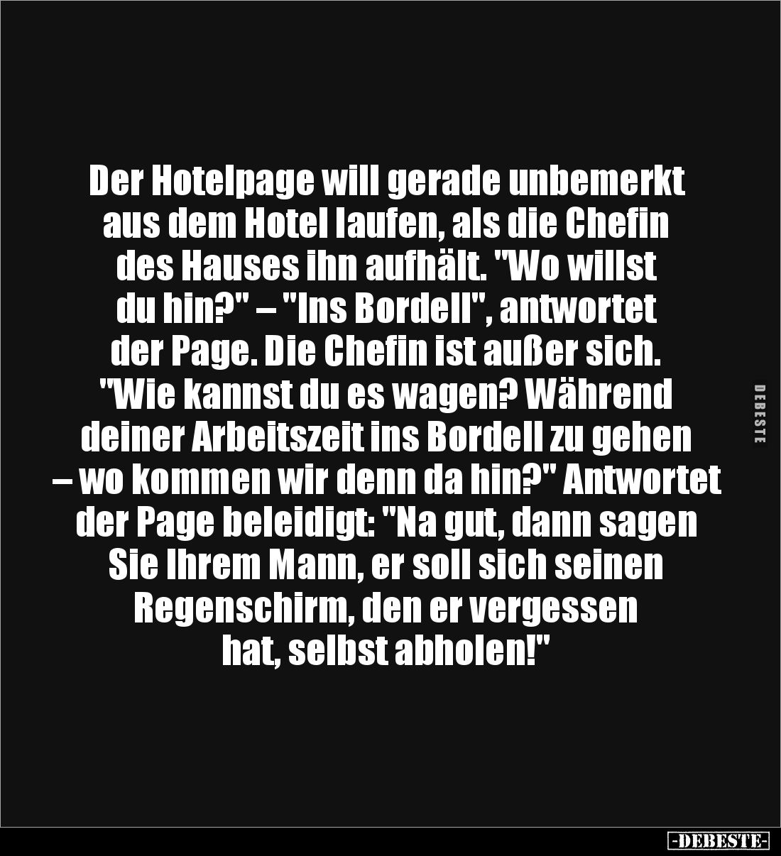 Der Hotelpage will gerade unbemerkt aus dem Hotel laufen, als die Chefin des Hauses ihn aufhält. "Wo willst du hin?" – "Ins Bordell", antwortet der Page. Die Chefin ist außer sich. "Wie kannst du es wagen? Während deiner Arbeitszeit ins Bordell zu gehen – wo kommen wir denn da hin?" Antwortet der Page beleidigt: "Na gut, dann sagen Sie Ihrem Mann, er soll sich seinen Regenschirm, den er vergessen hat, selbst abholen!"