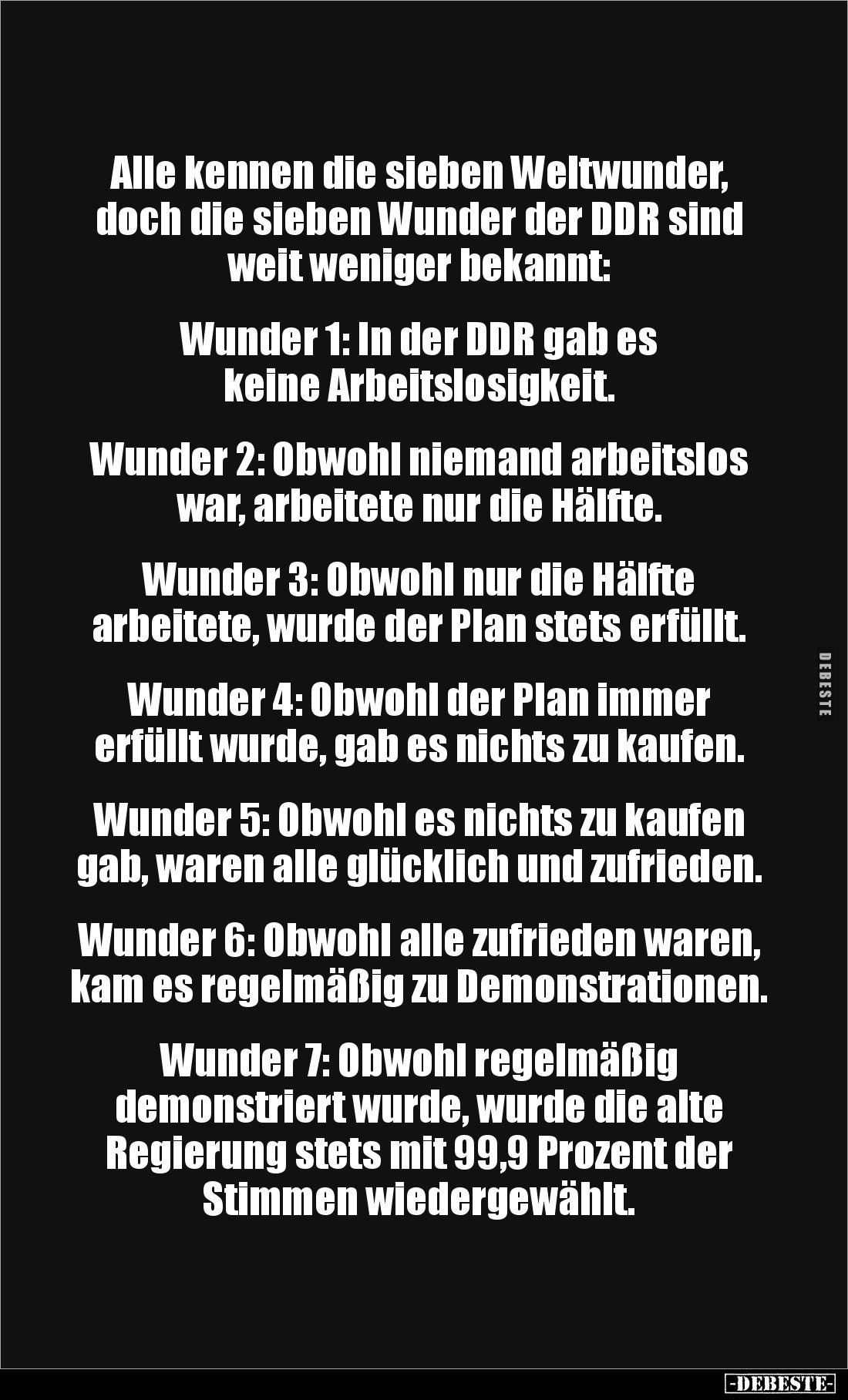 Alle kennen die sieben Weltwunder, doch die sieben Wunder der DDR sind weit weniger bekannt: Wunder 1: In der DDR gab es keine Arbeitslosigkeit. Wunder 2: Obwohl niemand arbeitslos war, arbeitete nur die Hälfte. Wunder 3: Obwohl nur die Hälfte arbeitete, wurde der Plan stets erfüllt. Wunder 4: Obwohl der Plan immer erfüllt wurde, gab es nichts zu kaufen. Wunder 5: Obwohl es nichts zu kaufen gab, waren alle glücklich und zufrieden. Wunder 6: Obwohl alle zufrieden waren, kam es regelmäßig zu Demonstrationen. Wunder 7: Obwohl regelmäßig demonstriert wurde, wurde die alte Regierung stets mit 99,9 Prozent der Stimmen wiedergewählt.