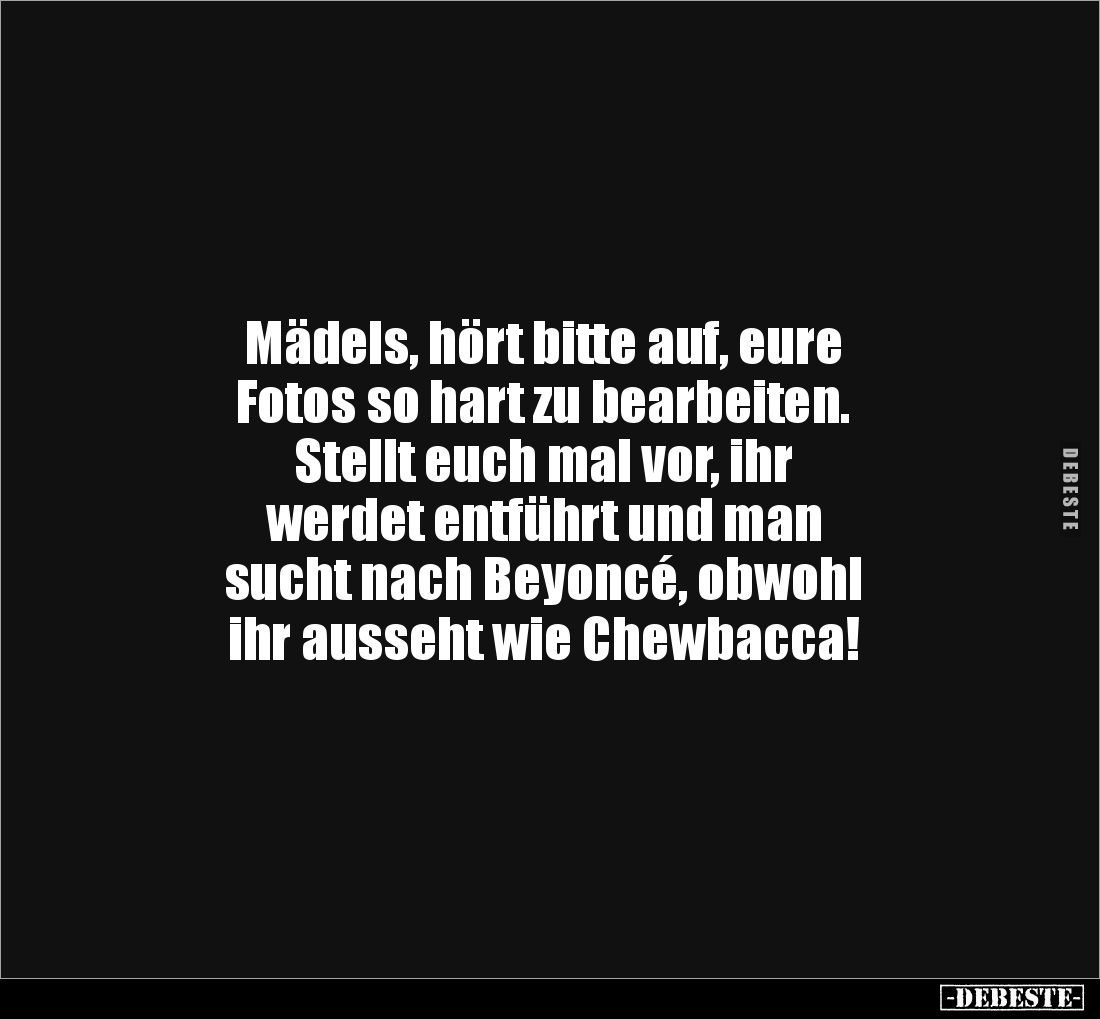 Mädels, hört bitte auf, eure Fotos so hart zu bearbeiten. Stellt euch mal vor, ihr werdet entführt und man sucht nach Beyoncé, obwohl ihr ausseht wie Chewbacca!