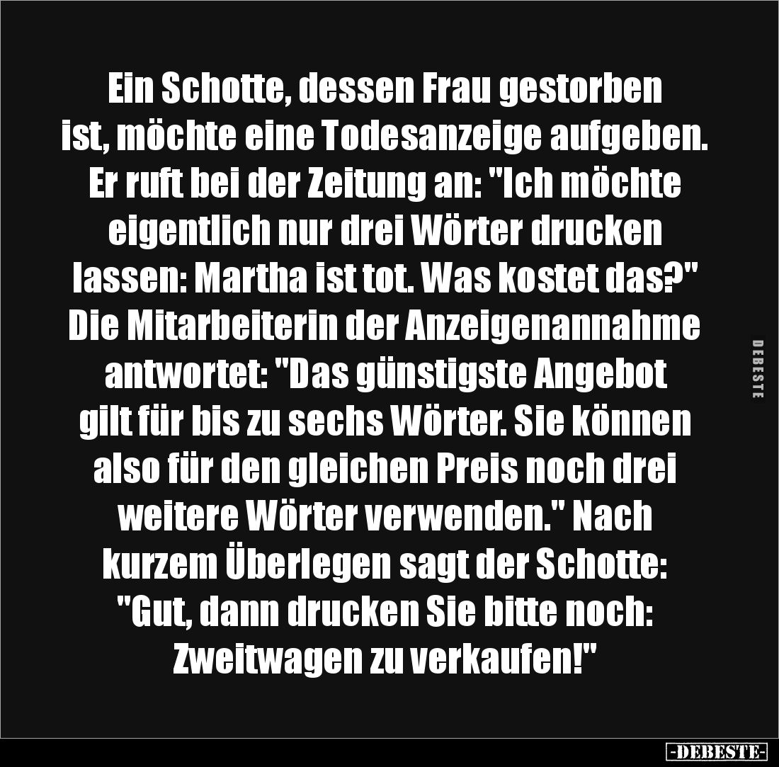 Ein Schotte, dessen Frau gestorben ist, möchte eine Todesanzeige aufgeben. Er ruft bei der Zeitung an: "Ich möchte eigentlich nur drei Wörter drucken lassen: Martha ist tot. Was kostet das?" Die Mitarbeiterin der Anzeigenannahme antwortet: "Das günstigste Angebot gilt für bis zu sechs Wörter. Sie können also für den gleichen Preis noch drei weitere Wörter verwenden." Nach kurzem Überlegen sagt der Schotte: "Gut, dann drucken Sie bitte noch: Zweitwagen zu verkaufen!"