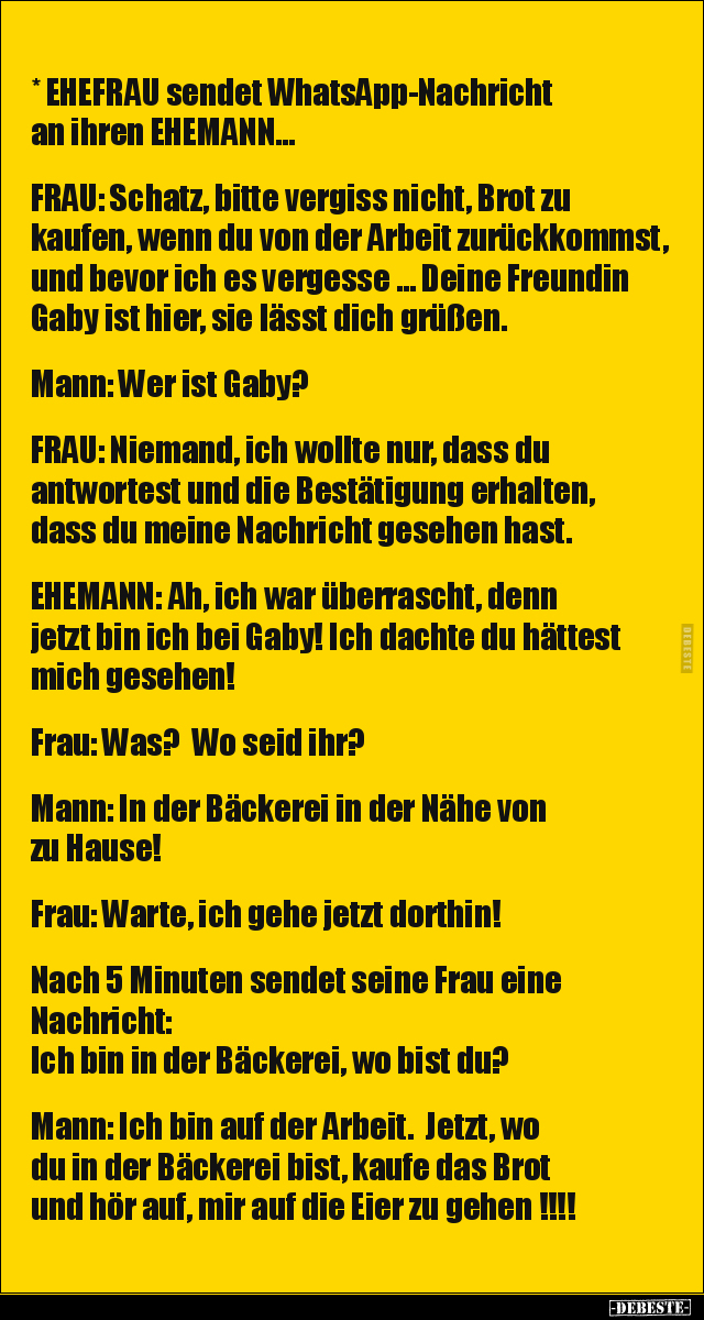 Mann: Ich bin auf der Arbeit. Jetzt, wo du in der Bäckerei bist, kaufe das Brot und hör auf, mir auf die Eier zu gehen !!!!
