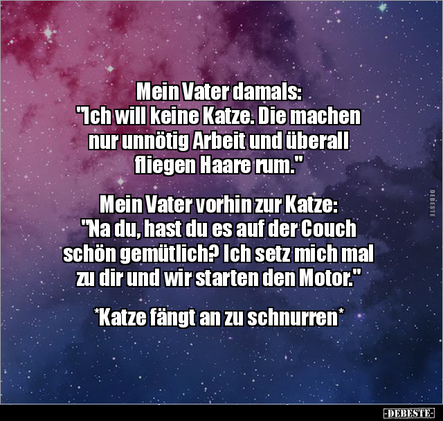 Mein Vater damals: "Ich will keine Katze. Die machen nur unnötig Arbeit und überall fliegen Haare rum." Mein Vater vorhin zur Katze: "Na du, hast du es auf der Couch schön gemütlich? Ich setz mich mal zu dir und wir starten den Motor." *Katze fängt an zu schnurren*