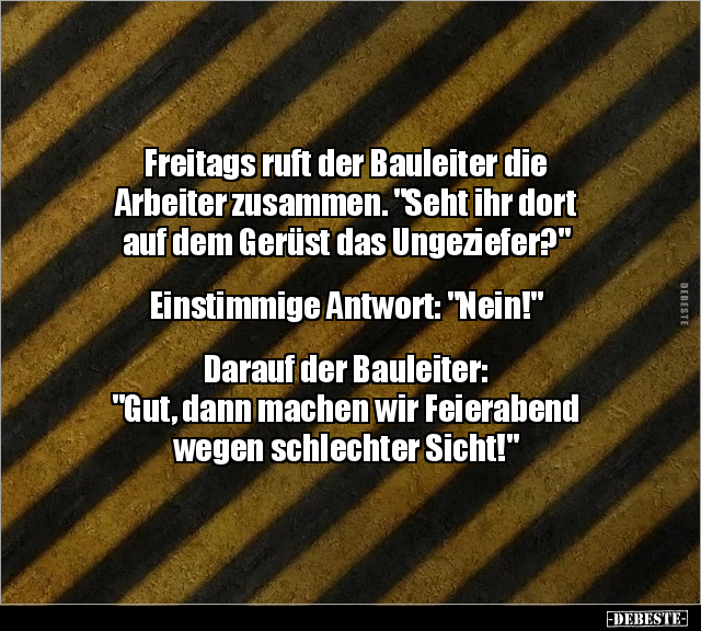 Freitags ruft der Bauleiter die Arbeiter zusammen. "Seht ihr dort auf dem Gerüst das Ungeziefer?" Einstimmige Antwort: "Nein!" Darauf der Bauleiter: "Gut, dann machen wir Feierabend wegen schlechter Sicht!"
