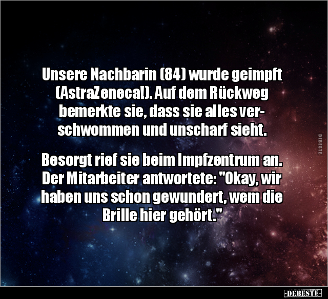 Unsere Nachbarin (84) wurde geimpft (AstraZeneca!). Auf dem Rückweg bemerkte sie, dass sie alles ver- schwommen und unscharf sieht. Besorgt rief sie beim Impfzentrum an. Der Mitarbeiter antwortete: "Okay, wir haben uns schon gewundert, wem die Brille hier gehört."