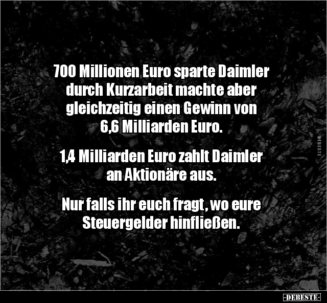 700 Millionen Euro sparte Daimler durch Kurzarbeit machte aber gleichzeitig einen Gewinn von 6,6 Milliarden Euro. 1,4 Milliarden Euro zahlt Daimler an Aktionäre aus. Nur falls ihr euch fragt, wo eure Steuergelder hinfließen.
