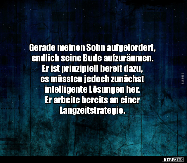 Gerade meinen Sohn aufgefordert, endlich seine Bude aufzuräumen. Er ist prinzipiell bereit dazu, es müssten jedoch zunächst intelligente Lösungen her. Er arbeite bereits an einer Langzeitstrategie.