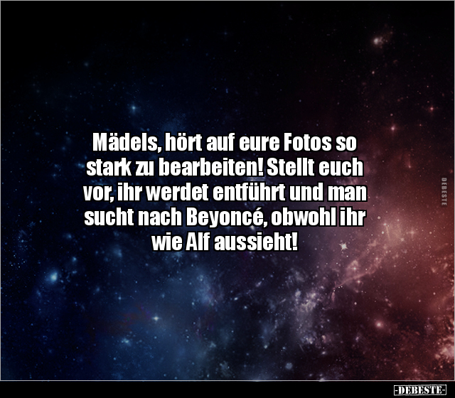 Mädels, hört auf eure Fotos so stark zu bearbeiten! Stellt euch vor, ihr werdet entführt und man sucht nach Beyoncé, obwohl ihr wie Alf aussieht!