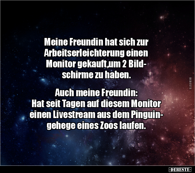 Meine Freundin hat sich zur Arbeitserleichterung einen Monitor gekauft,um 2 Bild- schirme zu haben. Auch meine Freundin: Hat seit Tagen auf diesem Monitor einen Livestream aus dem Pinguin- gehege eines Zoos laufen.