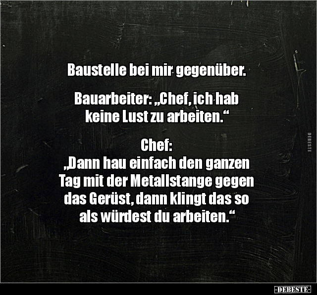 Baustelle bei mir gegenüber. Bauarbeiter: „Chef, ich hab keine Lust zu arbeiten.“ Chef: „Dann hau einfach den ganzen Tag mit der Metallstange gegen das Gerüst, dann klingt das so als würdest du arbeiten.“