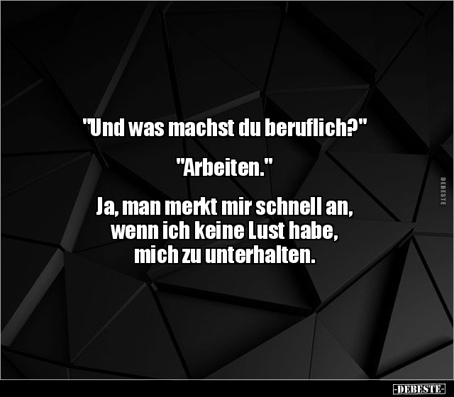 "Und was machst du beruflich?" "Arbeiten." Ja, man merkt mir schnell an, wenn ich keine Lust habe, mich zu unterhalten.