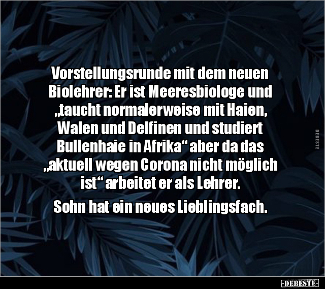 Vorstellungsrunde mit dem neuen Biolehrer: Er ist Meeresbiologe und „taucht normalerweise mit Haien, Walen und Delfinen und studiert Bullenhaie in Afrika“ aber da das „aktuell wegen Corona nicht möglich ist“ arbeitet er als Lehrer. Sohn hat ein neues Lieblingsfach.