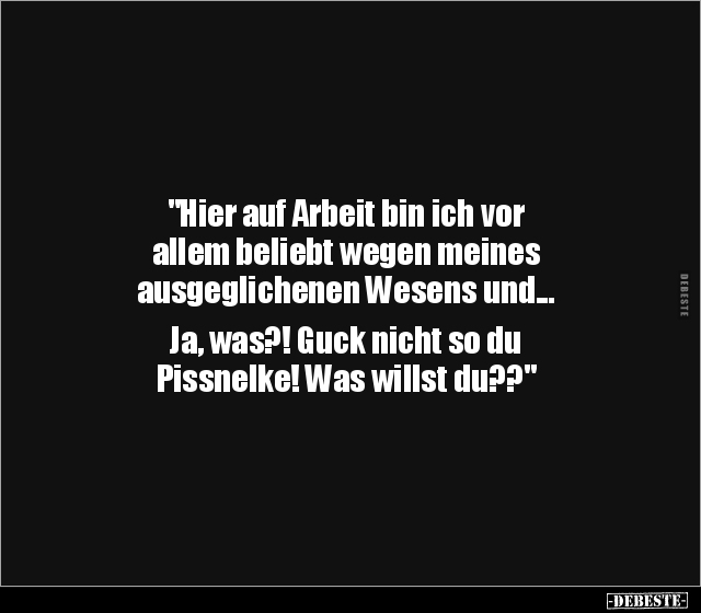 "Hier auf Arbeit bin ich vor allem beliebt wegen meines ausgeglichenen Wesens und... Ja, was?! Guck nicht so du Pissnelke! Was willst du??"