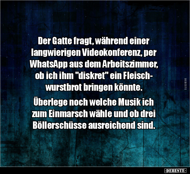 Der Gatte fragt, während einer langwierigen Videokonferenz, per WhatsApp aus dem Arbeitszimmer, ob ich ihm "diskret" ein Fleisch- wurstbrot bringen könnte. Überlege noch welche Musik ich zum Einmarsch wähle und ob drei Böllerschüsse ausreichend sind.