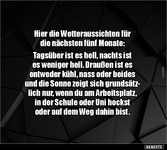 Hier die Wetteraussichten für die nächsten fünf Monate: Tagsüber ist es hell, nachts ist es weniger hell. Draußen ist es entweder kühl, nass oder beides und die Sonne zeigt sich grundsätz- lich nur, wenn du am Arbeitsplatz, in der Schule oder Uni hockst oder auf dem Weg dahin bist.