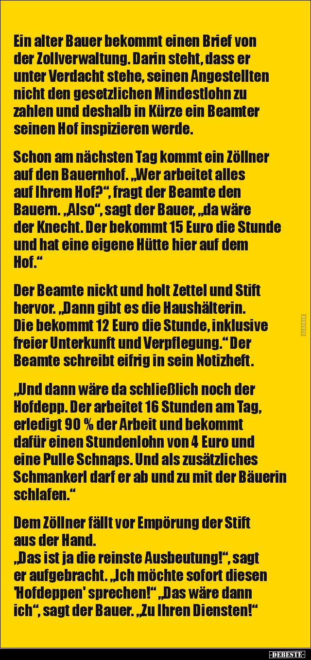 Ein alter Bauer bekommt einen Brief von der Zollverwaltung. Darin steht, dass er unter Verdacht stehe, seinen Angestellten nicht den gesetzlichen Mindestlohn zu zahlen und deshalb in Kürze ein Beamter seinen Hof inspizieren werde. Schon am nächsten Tag kommt ein Zöllner auf den Bauernhof. „Wer arbeitet alles auf Ihrem Hof?“, fragt der Beamte den Bauern. „Also“, sagt der Bauer, „da wäre der Knecht. Der bekommt 15 Euro die Stunde und hat eine eigene Hütte hier auf dem Hof.“ Der Beamte nickt und holt Zettel und Stift hervor. „Dann gibt es die Haushälterin. Die bekommt 12 Euro die Stunde, inklusive freier Unterkunft und Verpflegung.“ Der Beamte schreibt eifrig in sein Notizheft. „Und dann wäre da schließlich noch der Hofdepp. Der arbeitet 16 Stunden am Tag, erledigt 90 % der Arbeit und bekommt dafür einen Stundenlohn von 4 Euro und eine Pulle Schnaps. Und als zusätzliches Schmankerl darf er ab und zu mit der Bäuerin schlafen.“ Dem Zöllner fällt vor Empörung der Stift aus der Hand. „Das ist ja die reinste Ausbeutung!“, sagt er aufgebracht. „Ich möchte sofort diesen 'Hofdeppen' sprechen!“ „Das wäre dann ich“, sagt der Bauer. „Zu Ihren Diensten!“