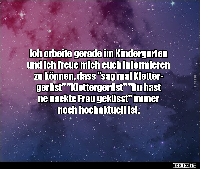 Ich arbeite gerade im Kindergarten und ich freue mich euch informieren zu können, dass "sag mal Kletter- gerüst" "Klettergerüst" "Du hast ne nackte Frau geküsst" immer noch hochaktuell ist.