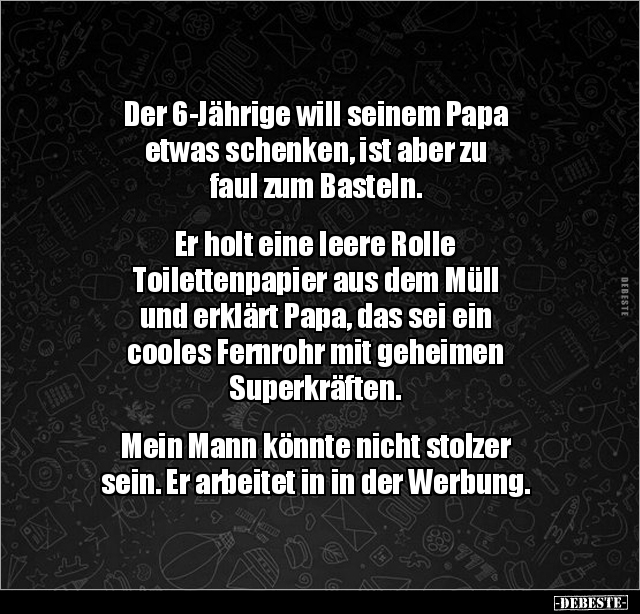 Der 6-Jährige will seinem Papa etwas schenken, ist aber zu faul zum Basteln. Er holt eine leere Rolle Toilettenpapier aus dem Müll und erklärt Papa, das sei ein cooles Fernrohr mit geheimen Superkräften. Mein Mann könnte nicht stolzer sein. Er arbeitet in in der Werbung.