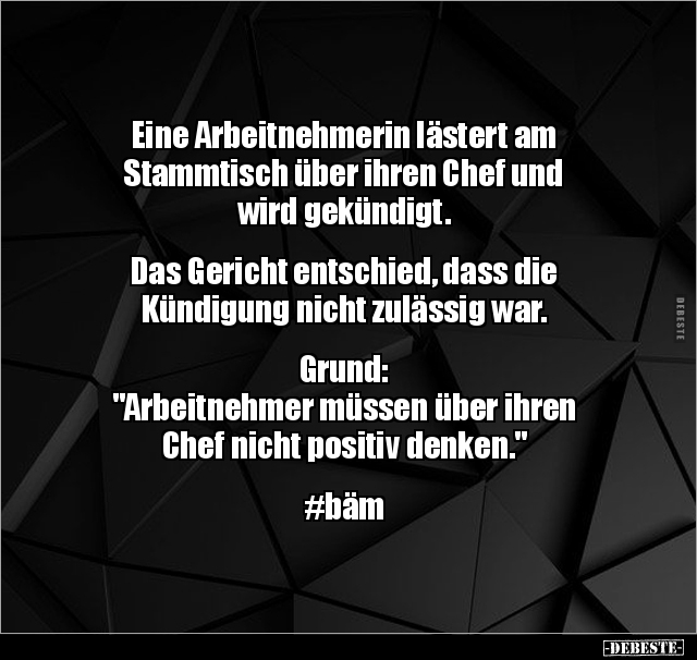Eine Arbeitnehmerin lästert am Stammtisch über ihren Chef und wird gekündigt. Das Gericht entschied, dass die Kündigung nicht zulässig war. Grund: "Arbeitnehmer müssen über ihren Chef nicht positiv denken." #bäm