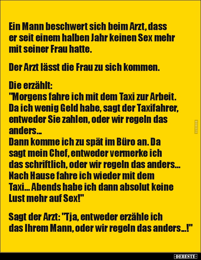 Ein Mann beschwert sich beim Arzt, dass er seit einem halben Jahr keinen Sex mehr mit seiner Frau hatte. Der Arzt lässt die Frau zu sich kommen. Die erzählt: "Morgens fahre ich mit dem Taxi zur Arbeit. Da ich wenig Geld habe, sagt der Taxifahrer, entweder Sie zahlen, oder wir regeln das anders... Dann komme ich zu spät im Büro an. Da sagt mein Chef, entweder vermerke ich das schriftlich, oder wir regeln das anders... Nach Hause fahre ich wieder mit dem Taxi... Abends habe ich dann absolut keine Lust mehr auf Sex!" Sagt der Arzt: "Tja, entweder erzähle ich das Ihrem Mann, oder wir regeln das anders...!"
