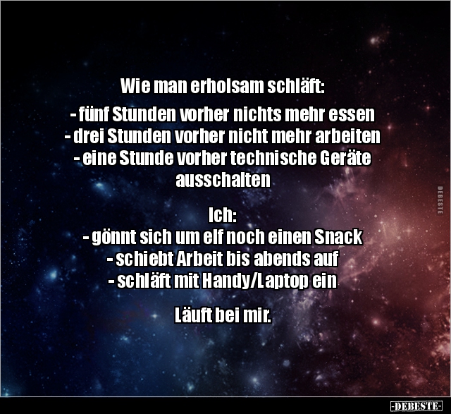 Wie man erholsam schläft: - fünf Stunden vorher nichts mehr essen - drei Stunden vorher nicht mehr arbeiten - eine Stunde vorher technische Geräte ausschalten Ich: - gönnt sich um elf noch einen Snack - schiebt Arbeit bis abends auf - schläft mit Handy/Laptop ein Läuft bei mir.