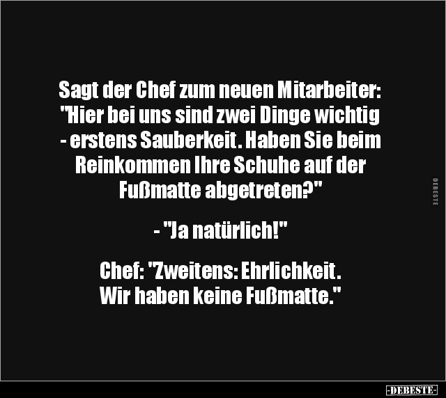 Sagt der Chef zum neuen Mitarbeiter: "Hier bei uns sind zwei Dinge wichtig - erstens Sauberkeit. Haben Sie beim Reinkommen Ihre Schuhe auf der Fußmatte abgetreten?" - "Ja natürlich!" Chef: "Zweitens: Ehrlichkeit. Wir haben keine Fußmatte."