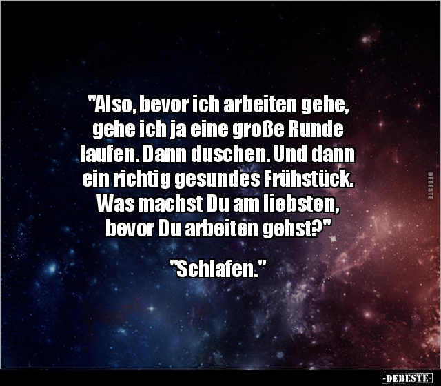 "Also, bevor ich arbeiten gehe, gehe ich ja eine große Runde laufen. Dann duschen. Und dann ein richtig gesundes Frühstück. Was machst Du am liebsten, bevor Du arbeiten gehst?" "Schlafen."