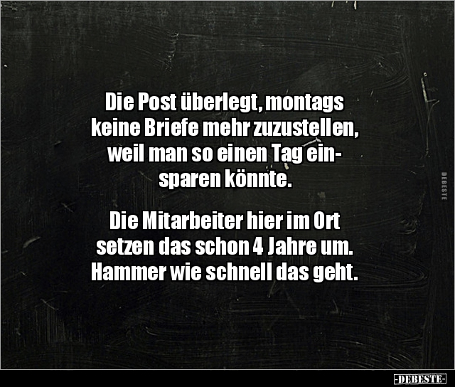 Die Post überlegt, montags keine Briefe mehr zuzustellen, weil man so einen Tag ein- sparen könnte. Die Mitarbeiter hier im Ort setzen das schon 4 Jahre um. Hammer wie schnell das geht.