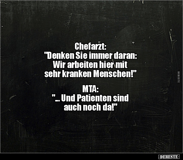 Chefarzt: "Denken Sie immer daran: Wir arbeiten hier mit sehr kranken Menschen!" MTA: "... Und Patienten sind auch noch da!"
