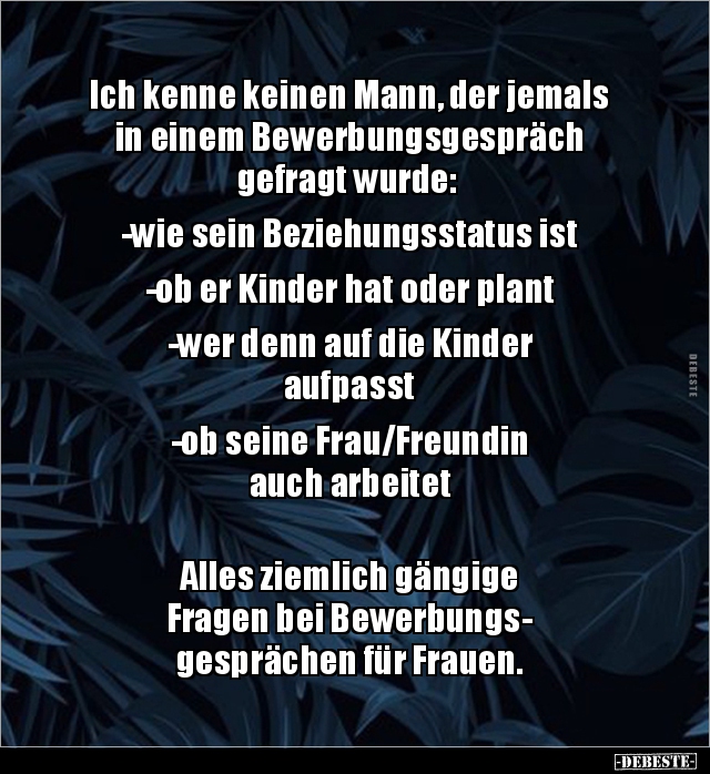Ich kenne keinen Mann, der jemals in einem Bewerbungsgespräch gefragt wurde: -wie sein Beziehungsstatus ist -ob er Kinder hat oder plant -wer denn auf die Kinder aufpasst -ob seine Frau/Freundin auch arbeitet Alles ziemlich gängige Fragen bei Bewerbungs- gesprächen für Frauen.