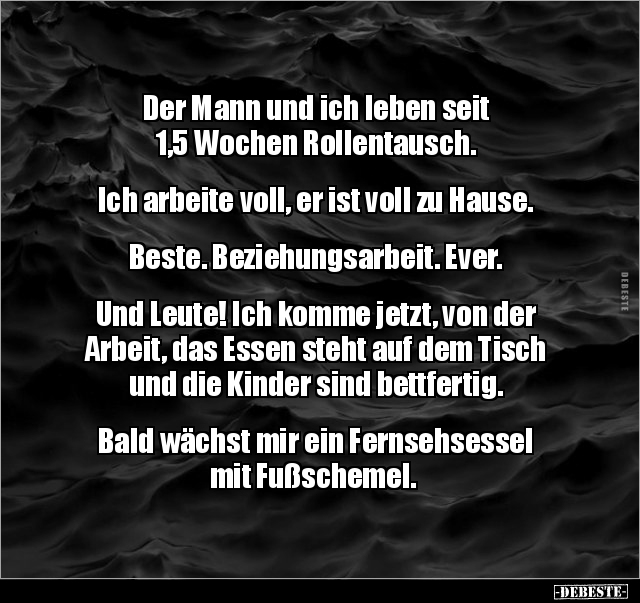 Der Mann und ich leben seit 1,5 Wochen Rollentausch. Ich arbeite voll, er ist voll zu Hause. Beste. Beziehungsarbeit. Ever. Und Leute! Ich komme jetzt, von der Arbeit, das Essen steht auf dem Tisch und die Kinder sind bettfertig. Bald wächst mir ein Fernsehsessel mit Fußschemel.